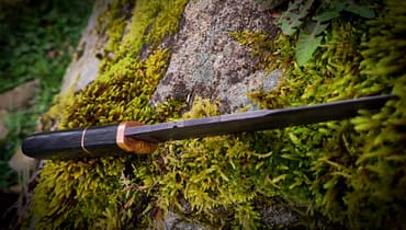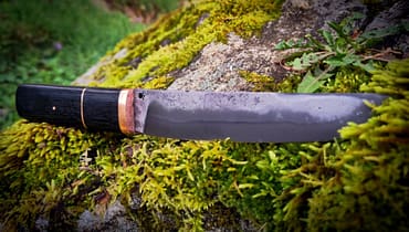 Couteau fixe à montage sur soie partielle, lame en XC75 avec trempe sélective et hamon. Manche en Morta et cuivre martelé. Utilisation en cuisine ou comme utilitaire.