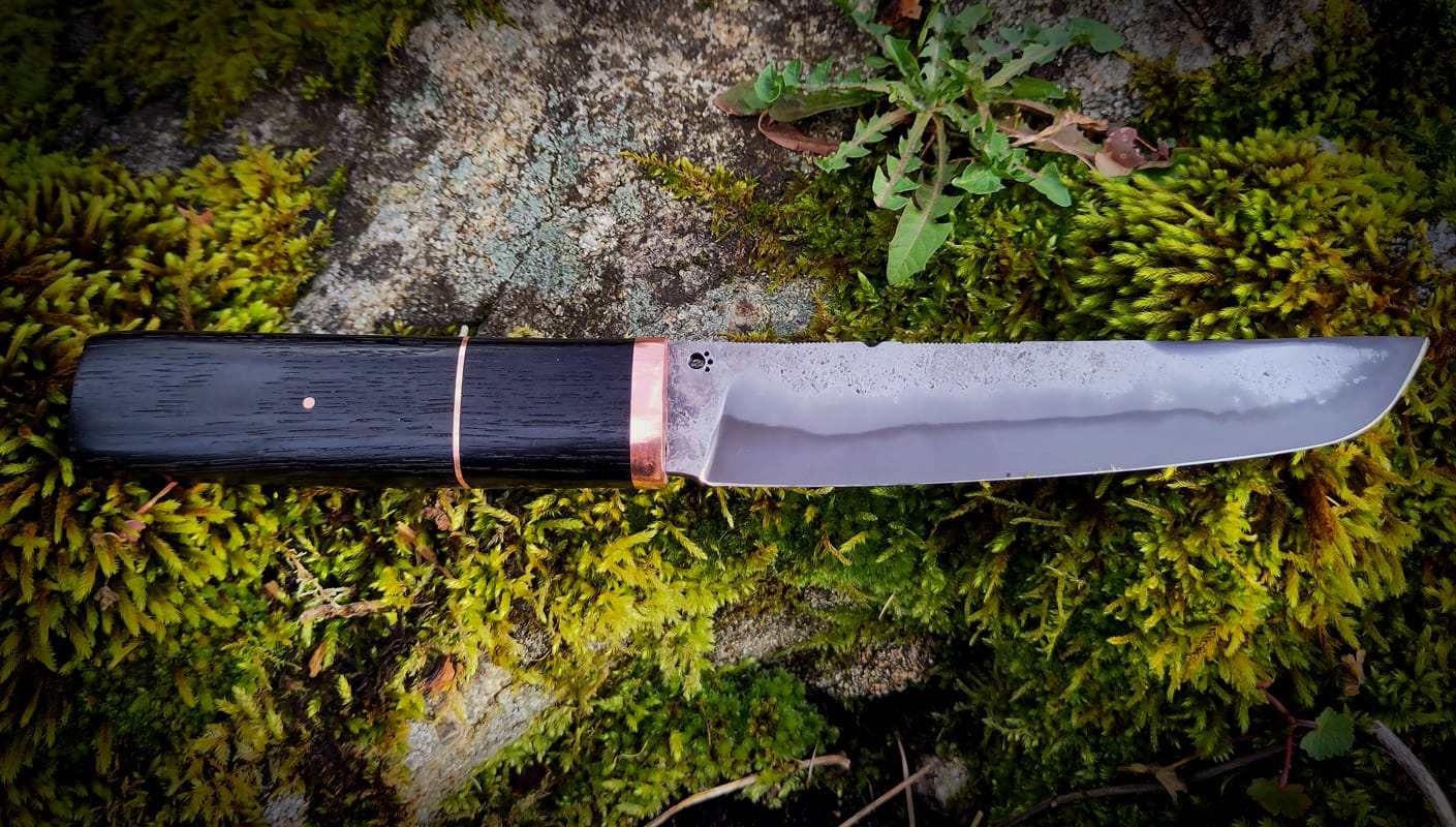 Couteau fixe à montage sur soie partielle, lame en XC75 avec trempe sélective et hamon. Manche en Morta et cuivre martelé. Utilisation en cuisine ou comme utilitaire.