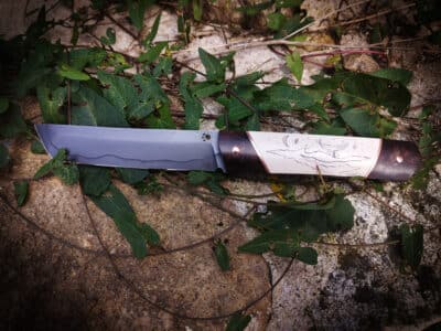Couteau utilitaire/camp avec gravure type skrimshaw.