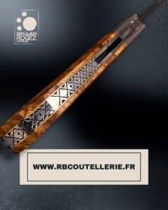 Couteau conçu, forgé et assemblé à l’atelier, 100%artisanal. Sur ce modèle, le damas a été créé par un artisan Français, je l’ai étiré et j’ai forgé la lame.