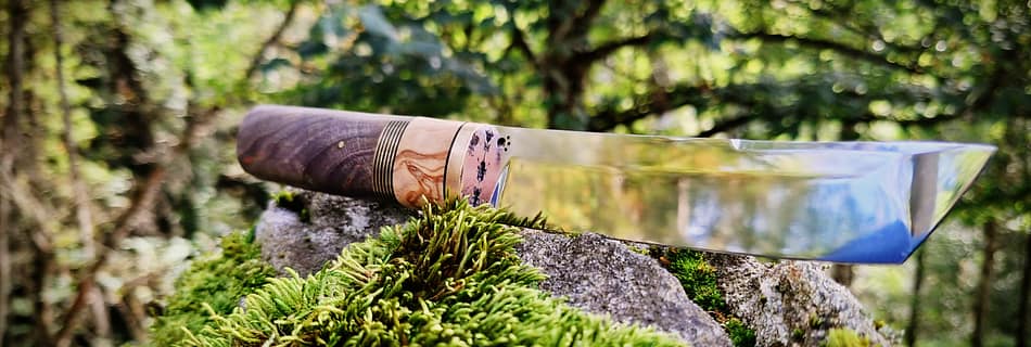 Couteau fixe à montage sur soie partielle, lame en XC75 avec trempe sélective et hamon. Manche en Morta et cuivre martelé. Utilisation en cuisine ou comme utilitaire. 285€ Vendu