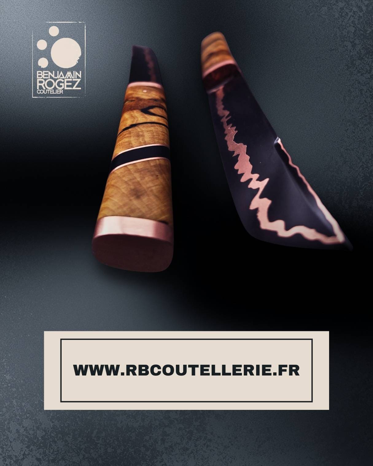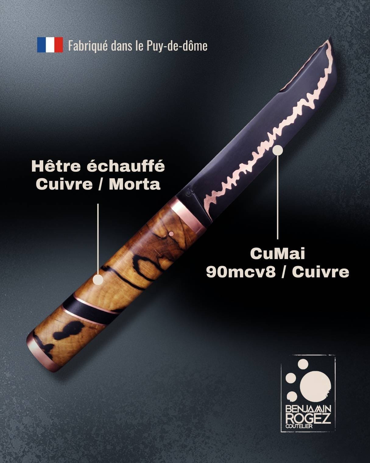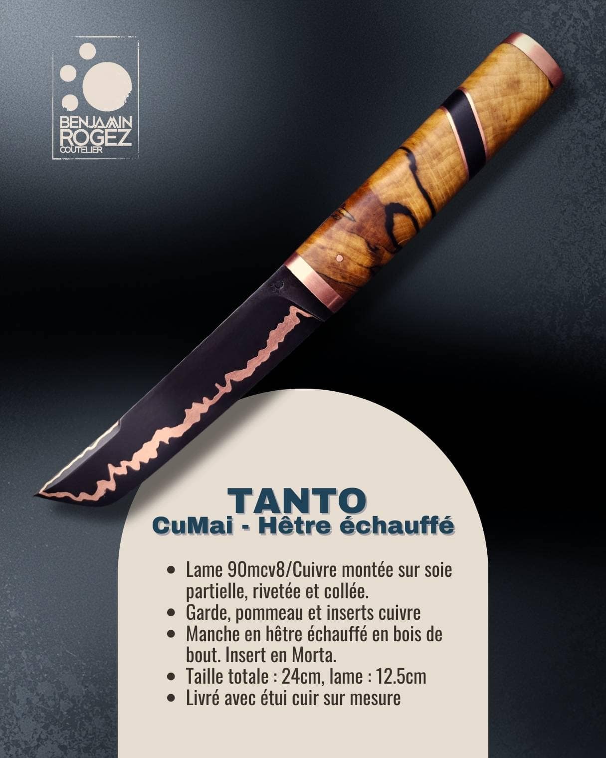 Utilitaire Tanto – Hêtre echauffé – CuMaipar dans Fixes,Outdoorsur Publié le Couteau utilitaire/camp lame CuMai. Lame Cumai 5 couches 90MCV8/cuivre. Monté sur soie partielle, collée et rivetée. Manche Hêtre echauffé en bois de bout, avec garde et pommeau en cuivre, insert cuivre et Morta. Rivet cuivre. Taille : 24,5cm 525€
